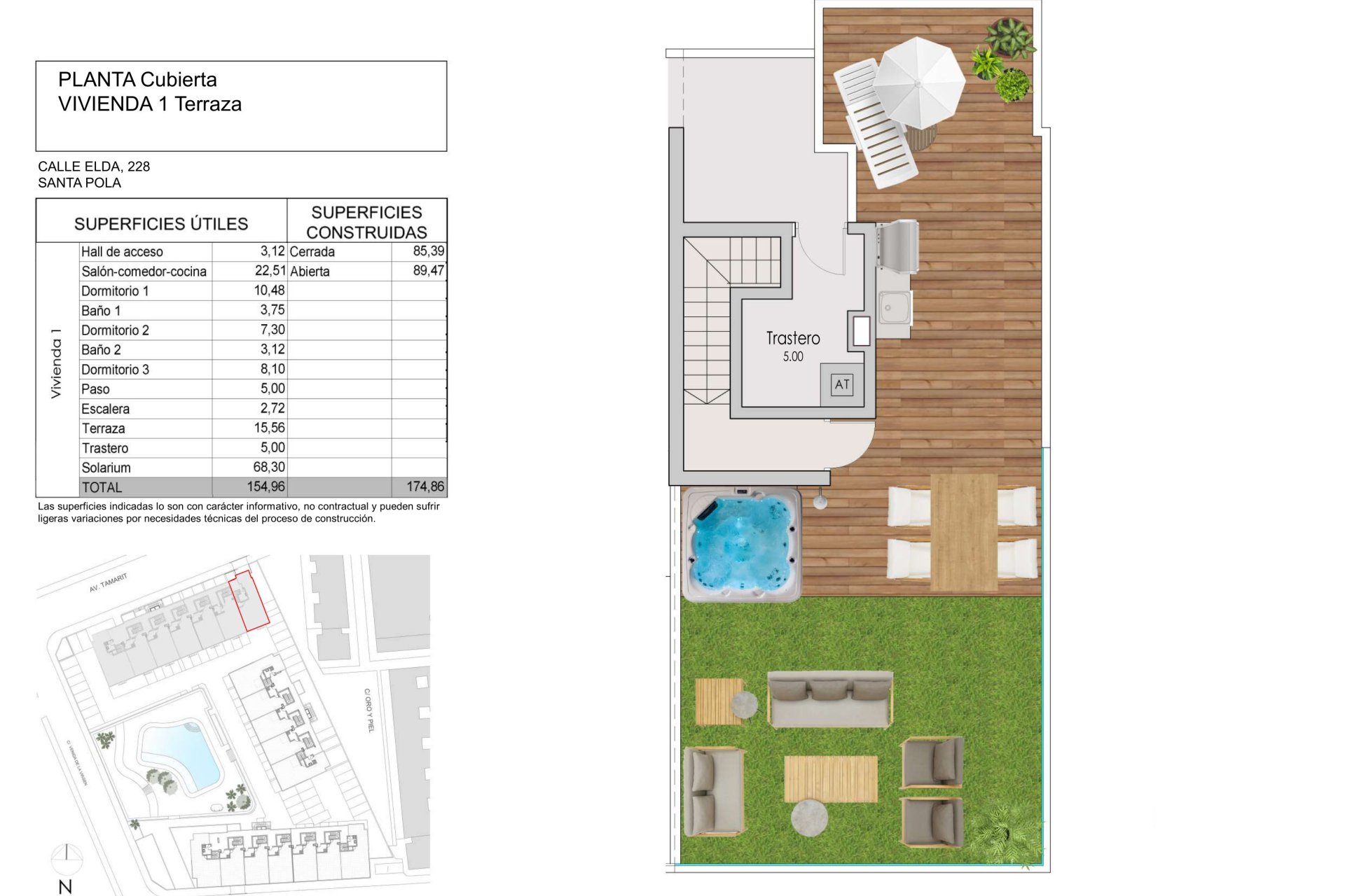 Exteriéry této rezidence v Santa Pole jsou navrženy tak, aby maximalizovaly požitek ze středomořského prostředí. Nemovitosti mají terasy, které nabízejí výhled na moře, ideální pro relaxaci venku. Navíc některé typy zahrnují solárium, které poskytuje další prostor pro volný čas a odpočinek na slunci. Přidání pergol a vířivek v určitých jednotkách přidává nádech luxusu a pohodlí, což umožňuje obyvatelům užívat si relaxační chvíle v soukromí svého domova.