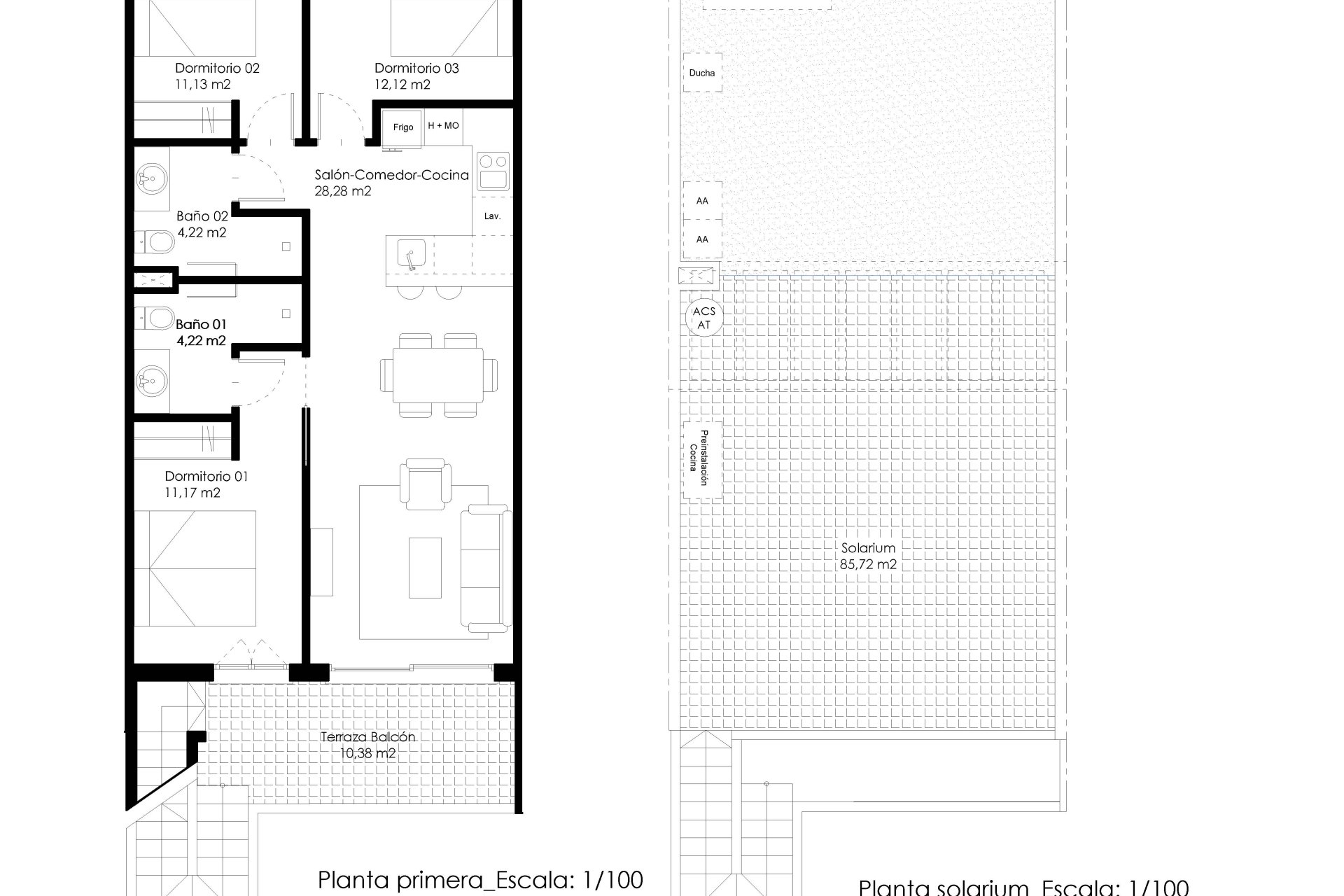 Los interiores de los bungalows en Pilar de la Horadada están diseñados para ofrecer comodidad y funcionalidad. Con opciones de 2 y 3 dormitorios, estos hogares se adaptan a diferentes necesidades familiares. Cada bungalow cuenta con 2 baños, asegurando privacidad y comodidad para todos los residentes. El diseño interior se centra en la optimización del espacio y la calidad de los acabados. Los suelos de gres porcelánico no solo aportan un toque moderno, sino que también son fáciles de mantener, ideales para un estilo de vida activo. Los armarios empotrados son una característica estándar, proporcionando soluciones de almacenamiento prácticas y eficientes. La preinstalación de aire acondicionado es un detalle que garantiza el confort durante todo el año, permitiendo a los residentes ajustar la temperatura a sus preferencias personales. La distribución de los espacios está pensada para maximizar la luz natural y crear un ambiente acogedor en cada estancia. Las terrazas privadas y, en el caso de los bungalows con solarium, los soláriums, añaden un valor extra a los interiores, ofreciendo una extensión del espacio habitable hacia el exterior, ideal para disfrutar del clima mediterráneo.