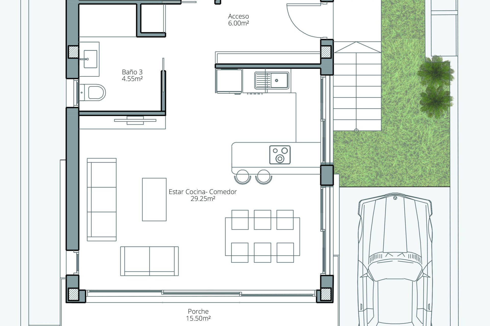 Los exteriores de estos adosados están pensados para maximizar el disfrute del clima mediterráneo. Cada propiedad cuenta con un jardín privado, perfecto para momentos de relajación o para disfrutar de actividades al aire libre. La presencia de una piscina privada añade un toque de lujo y exclusividad, permitiendo refrescarse en los días más cálidos. Además, las terrazas ofrecen un espacio adicional para disfrutar de las vistas al mar, convirtiéndose en el lugar ideal para cenas al aire libre o simplemente para contemplar el atardecer. El solárium es otro de los atractivos, proporcionando un espacio íntimo para tomar el sol o disfrutar de las vistas panorámicas.
