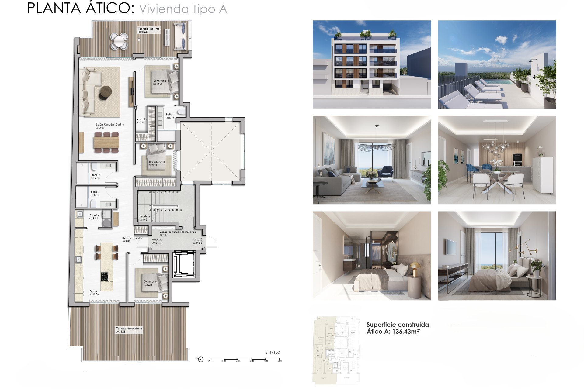 Los exteriores de estas viviendas están pensados para maximizar el disfrute del clima mediterráneo. Todas las propiedades cuentan con terrazas, perfectas para relajarse mientras se contempla el mar. Además, el residencial dispone de un solárium comunitario, ideal para tomar el sol y disfrutar de las vistas panorámicas. La cercanía al mar, a solo 700 metros, permite disfrutar de la playa en cualquier momento.