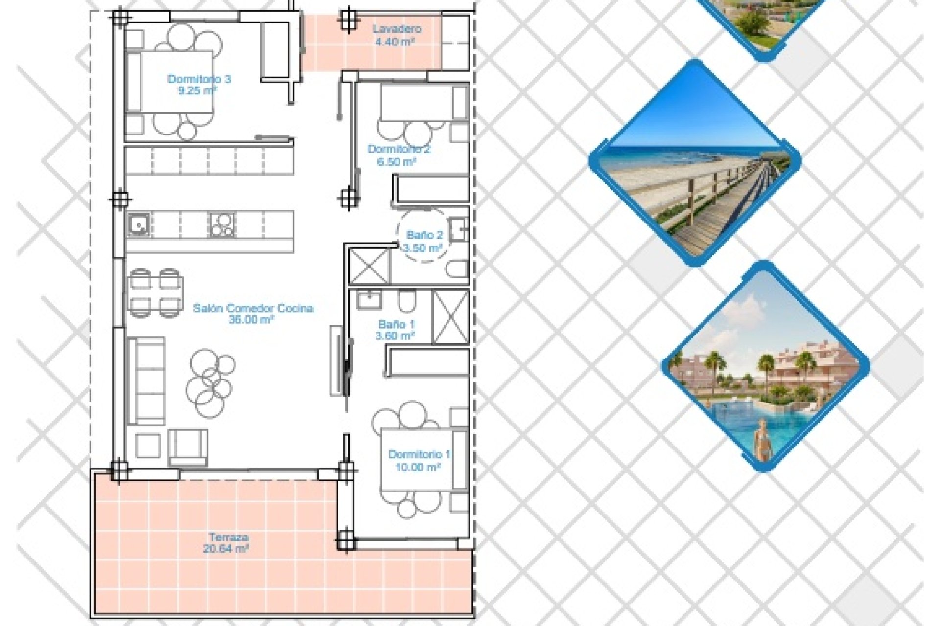 Ubicado en el encantador municipio de Pilar de la Horadada, este conjunto residencial ofrece una variedad de opciones de vivienda que se adaptan a diferentes necesidades. Con un total de 24 propiedades, los futuros residentes pueden elegir entre apartamentos, bajos, bungalows con solarium y bungalows con jardín. Esta diversidad tipológica asegura que cada familia o individuo encuentre su hogar ideal en un entorno que combina tranquilidad y accesibilidad. La proximidad al mar, a solo 2 km, permite disfrutar de la brisa marina y de agradables paseos por la costa. Además, el aeropuerto más cercano se encuentra a 48 km, facilitando los desplazamientos internacionales y nacionales. La ubicación estratégica de este residencial en Pilar de la Horadada lo convierte en una opción atractiva para quienes buscan un equilibrio entre comodidad y calidad de vida.