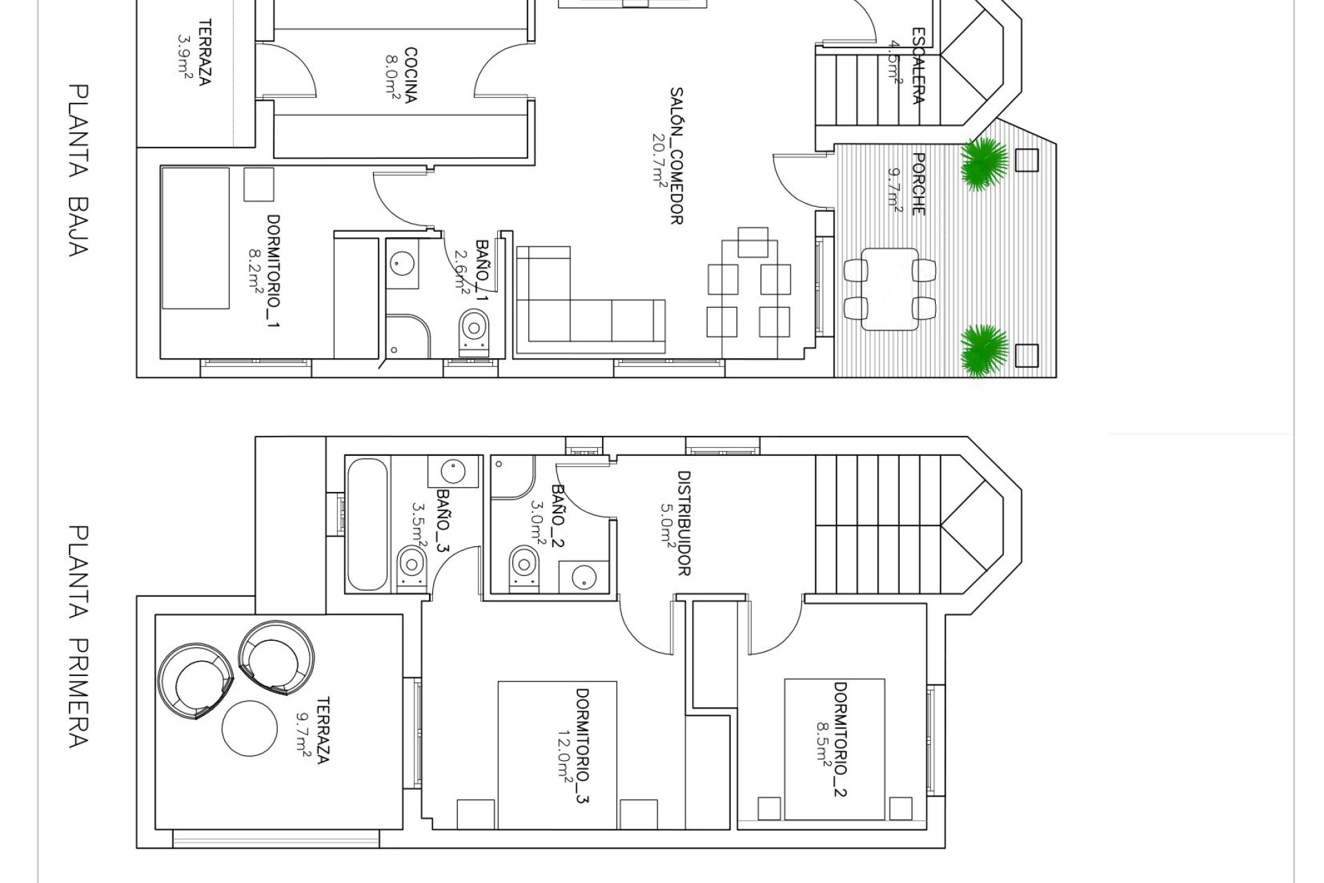 El interior de estas viviendas independientes está cuidadosamente diseñado para ofrecer comodidad y funcionalidad. Con tres dormitorios y tres baños, cada propiedad está equipada para satisfacer las necesidades de familias o parejas que buscan espacio y privacidad. Los suelos de gres porcelánico aportan un toque de elegancia y son fáciles de mantener. Los armarios empotrados en los dormitorios proporcionan un almacenamiento eficiente, manteniendo el espacio ordenado y libre de desorden. La distribución incluye un garaje, asegurando un lugar seguro para el estacionamiento y almacenamiento adicional.