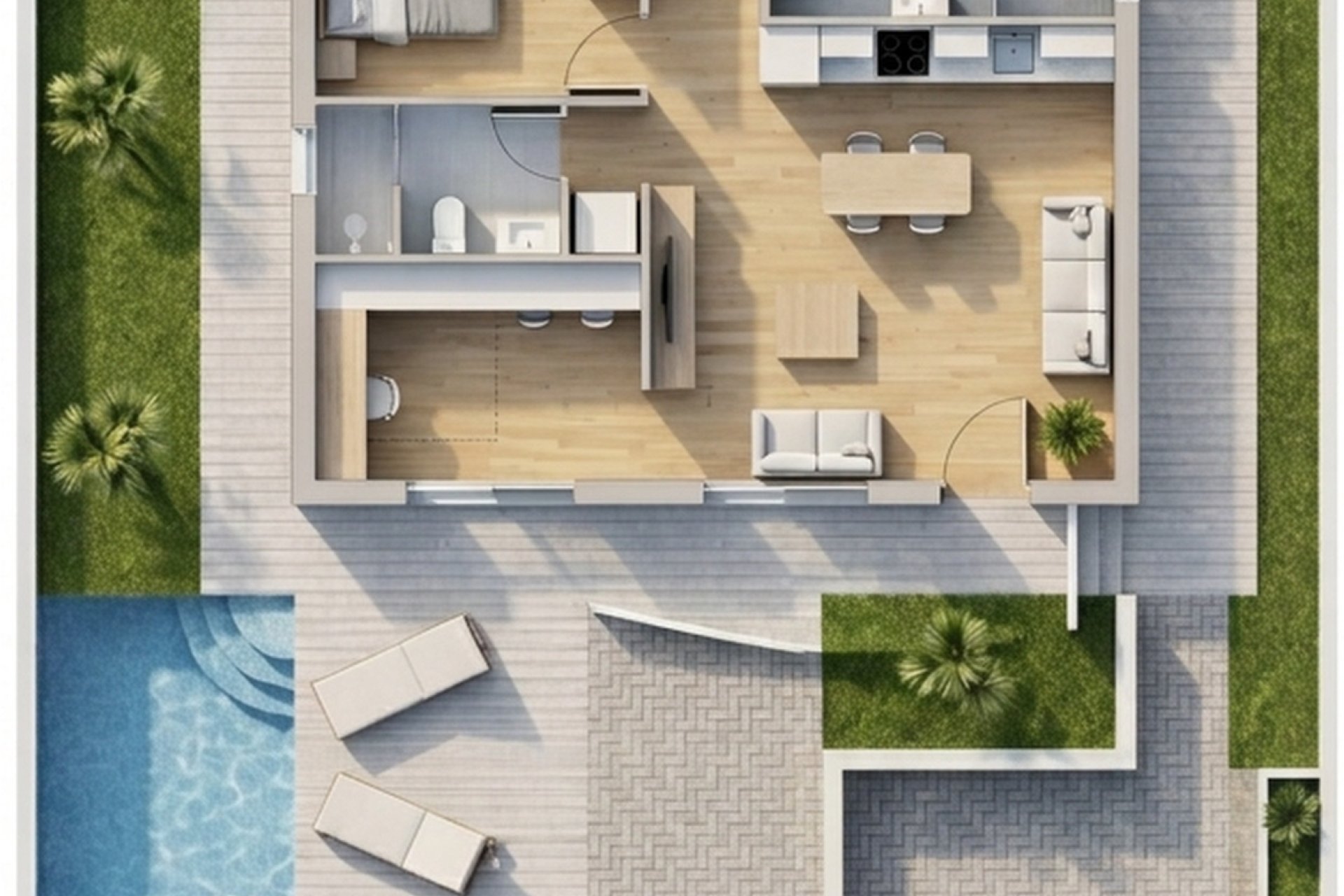 The exteriors of these bungalows are designed to maximize enjoyment of the Mediterranean climate. Each property features a private garden, perfect for creating a personal outdoor oasis. Additionally, the spacious terraces offer an ideal space for relaxation or entertaining guests. For those seeking an extra touch of luxury, some units include a solarium, providing additional space to enjoy the sun in total privacy. The inclusion of a private pool in each bungalow ensures moments of fun and relaxation without leaving home. Electric shutters not only add convenience but also contribute to the home's energy efficiency.