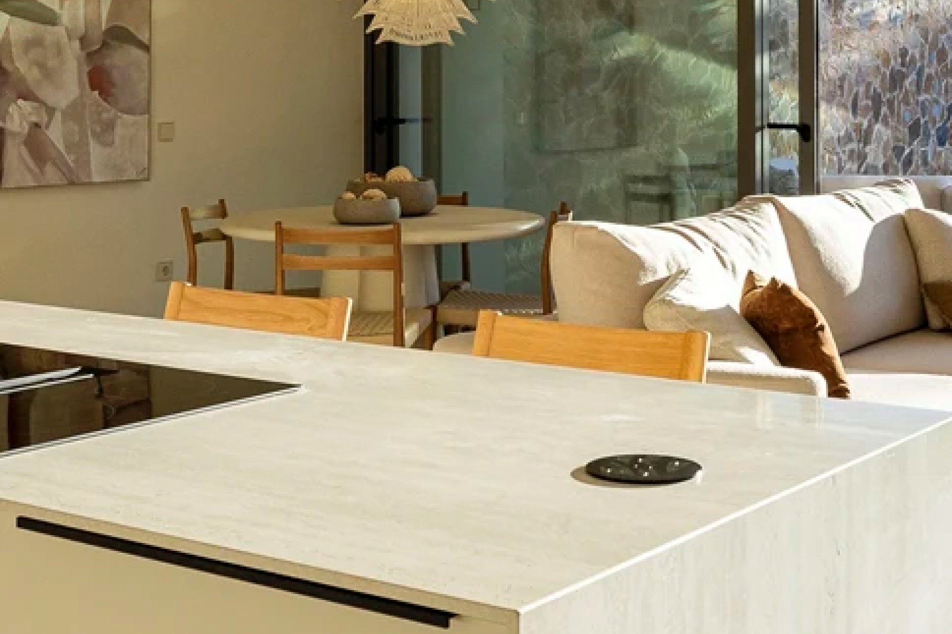 With 127 m² of built area set on a generous 486 m² plot, the villa has been designed to offer a serene, elegant lifestyle connected to nature. Its interiors, inspired by Mediterranean and nomadic aesthetics, feature bright, open spaces that invite relaxation and well-being. The day area is arranged around an open-plan living-dining room, where large windows frame the exterior and allow natural light to flow gently through every corner. The modern, functional kitchen blends in discreetly, preserving the clean and contemporary aesthetic that defines the home.